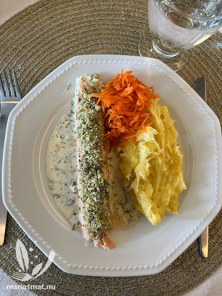 Servera ugnsbakad lax med krispigt täcke tillsammans med ett gott potatismos och riven morot.
